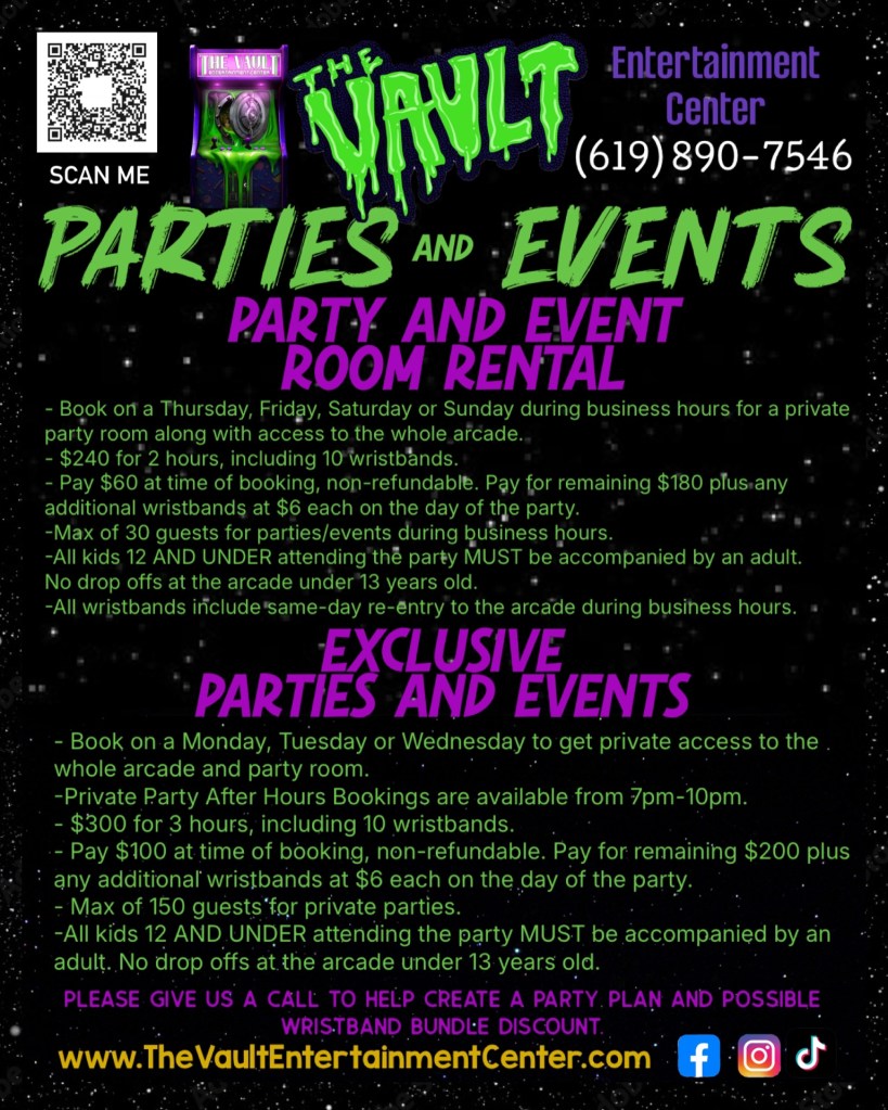 All kids 12 AND UNDER attending the party MUST be accompanied by an adult. No drop offs at the arcade under 13 years old.